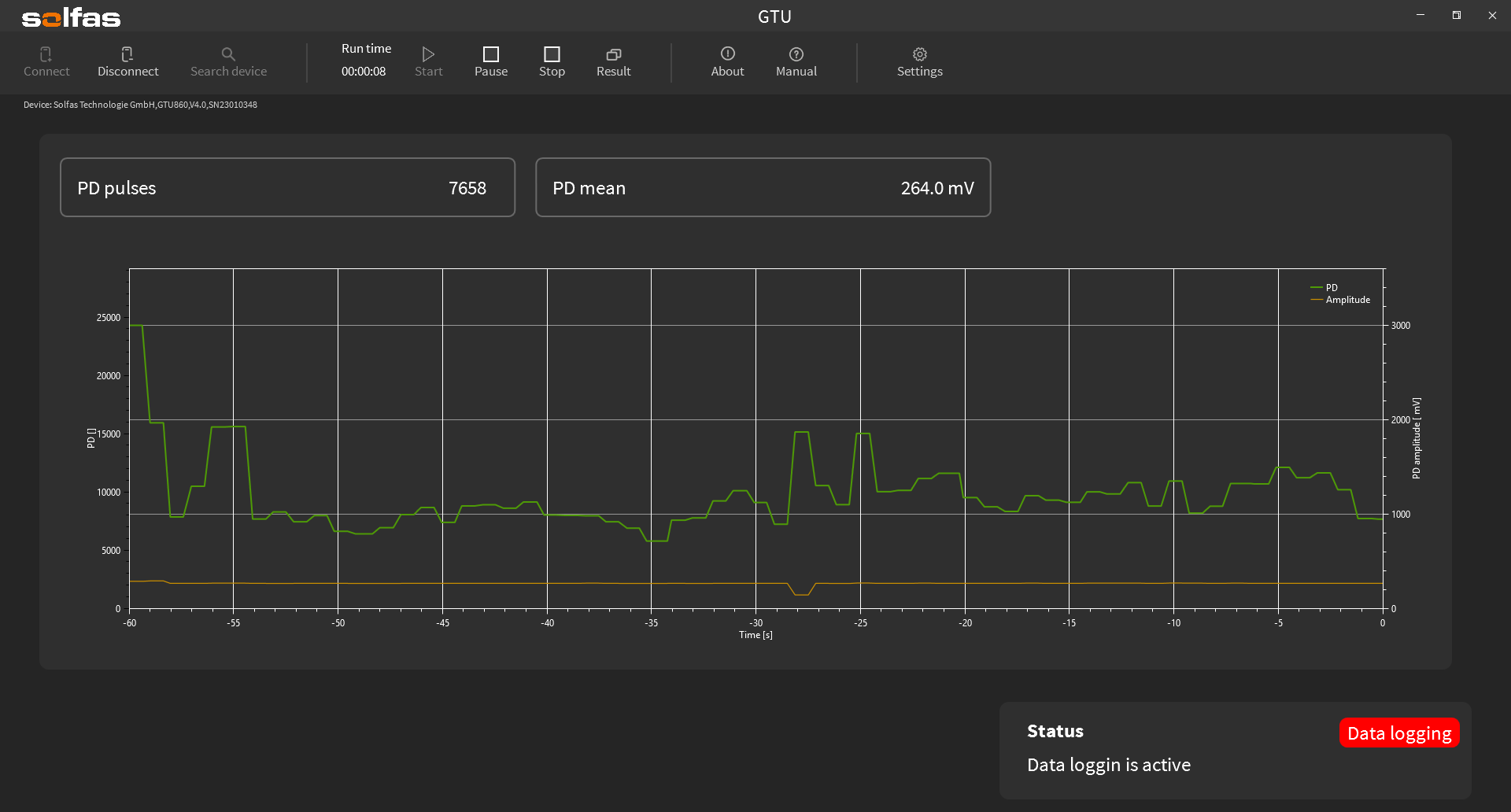 The continuous measurement mode for long term tests enables to record time-based PD pulses and amplitude.